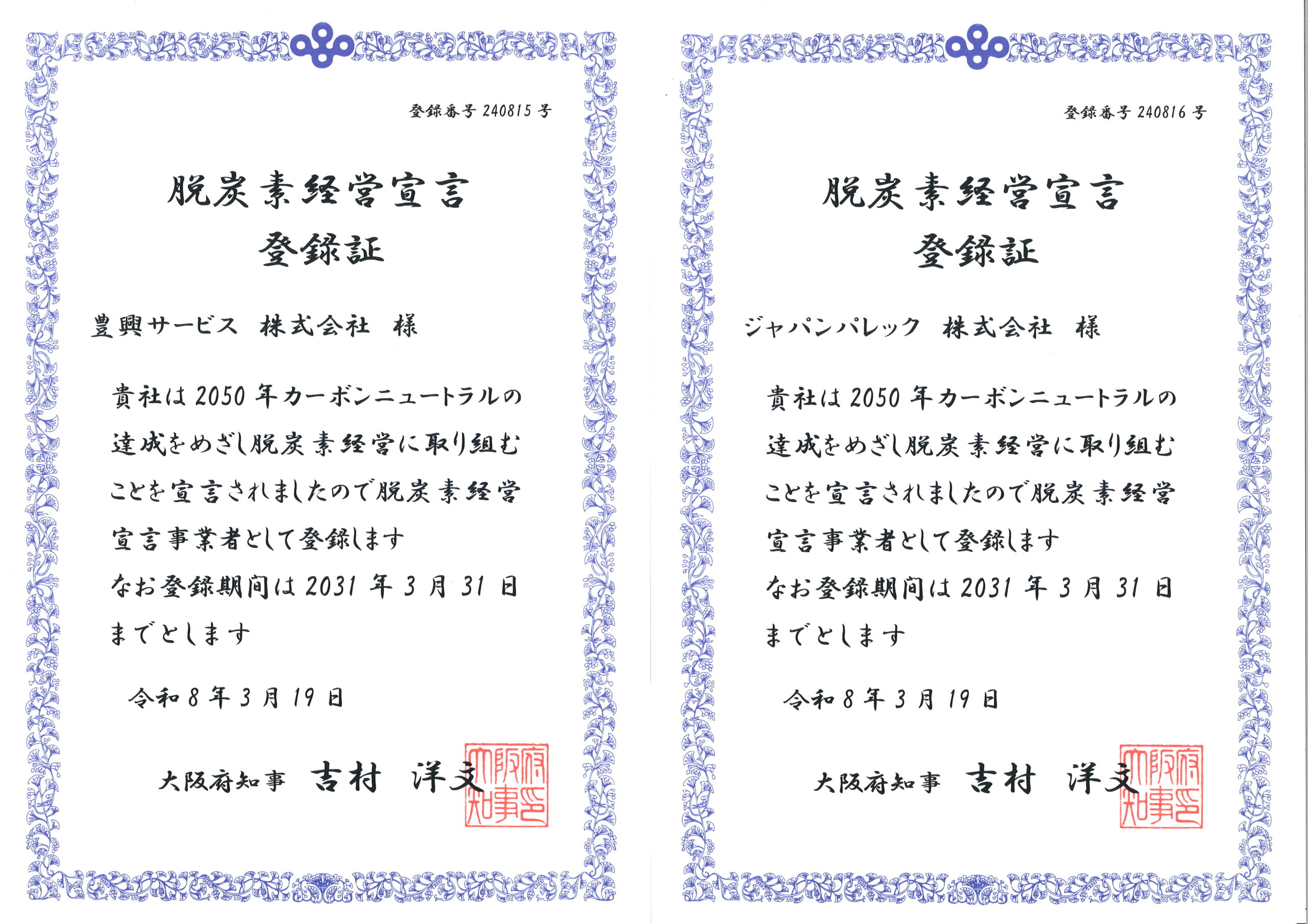 2026年3月19日大阪府が制度化した「脱炭素経営宣言登録制度」に登録しました。